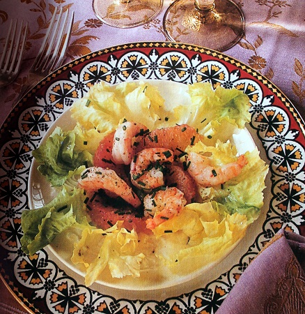 Entrada de Pomelos, camarones y hojas tiernas de soja o lechuga una fácil y exquisita idea para comenzar bien el banquete.